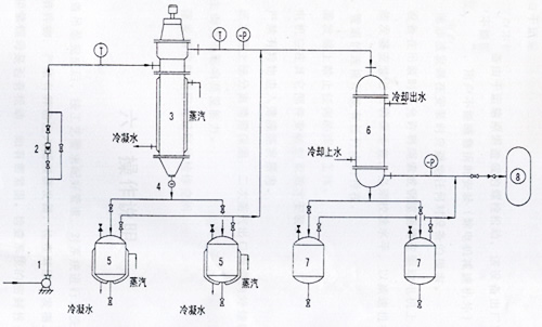 1 進(jìn)料泵 2 流量計(jì) 3 薄膜蒸發(fā)器 4 視鏡 5 濃縮液接受罐 6 冷凝器 7 冷凝液接受罐 8 真空泵